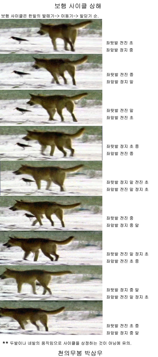 뒷다리의 추진과 이동 그 사이에 앞다리의 상태가 약간씩은 시차에 따라 움직임이 다른데도 불구하고 그것을 이해를