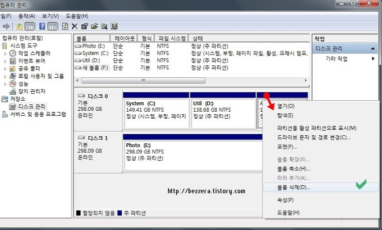 ▲ 다시 두개의 파티션을 합치기 위해서는 둘 중 하나의 볼륨을 삭제해야합니다.