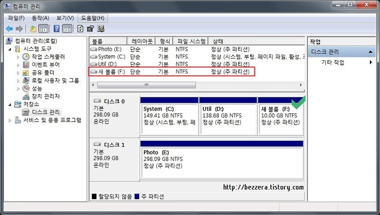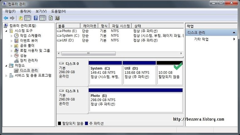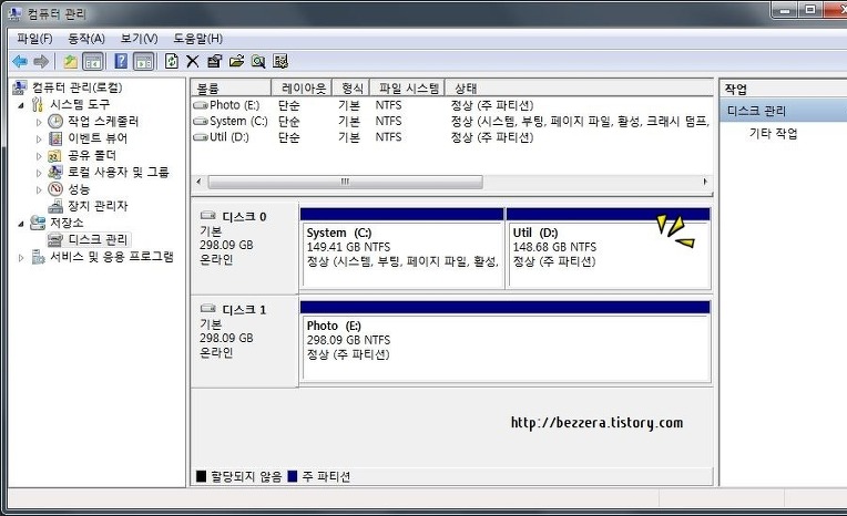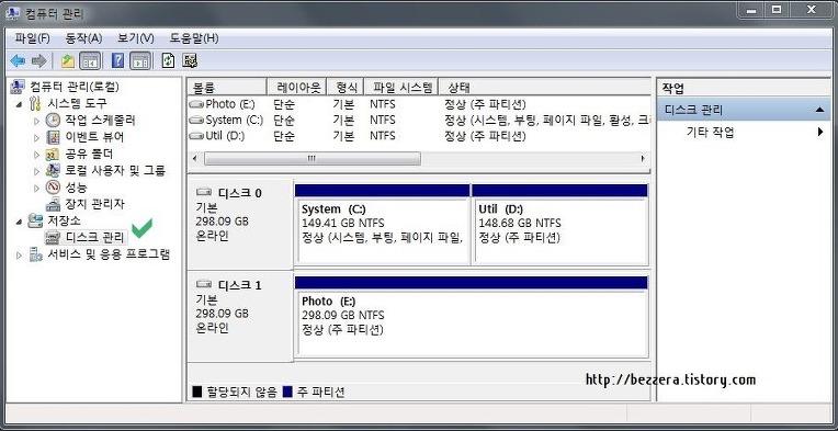 ▲ 컴퓨터관리 창에서 '디스크 관리' 탭을 클릭하면 위 그림과 같이 뜰껍니다.