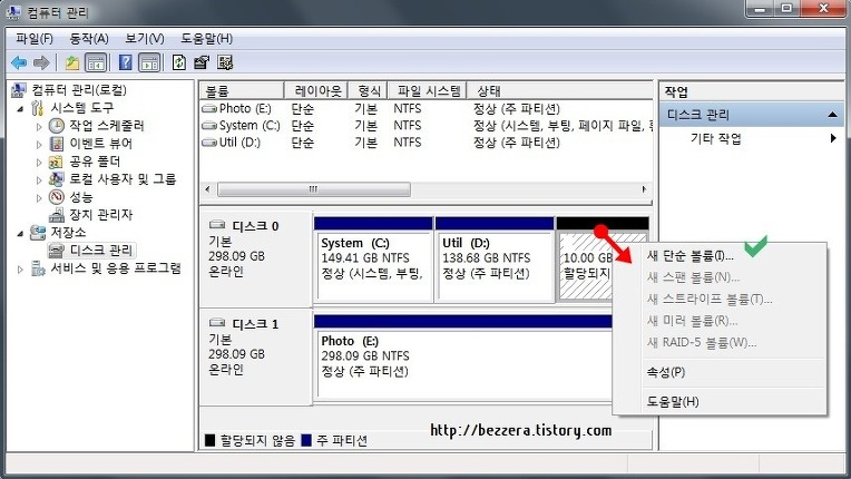 ▲ 분할된 부분에서 마우스 오른쪽을 누르고 '새 단순 볼륨'을 클릭합니다.