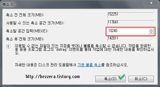 ▲ 축소할 공간 입력 부분에 원하는 용량을 넣고 '축소'를 누릅니다. (저는 대략 10기가 10240으로 했습니다.)
