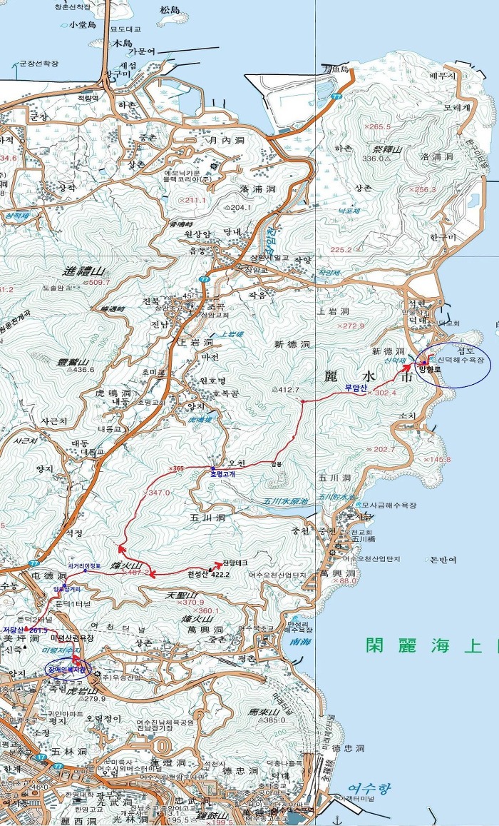 코 스 ; 여수장애인복지관-미평산림욕장-임도삼거리-봉화산-천성산-여수북초교-만성리해수욕장