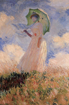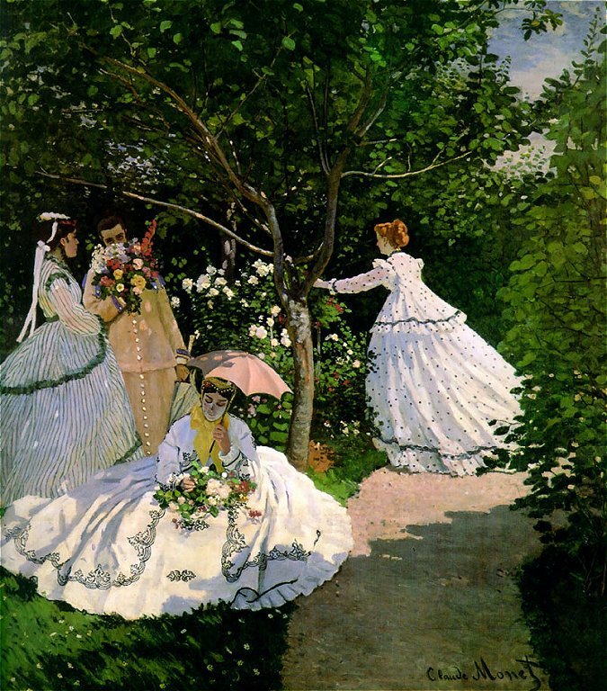 초창기 모네의 그림의 모티브는 정원풍경이 주류를 이룬다. 그러다보니 화면은 녹색이 주류를 이룬 가운데 하얀 드레스를 입은 여성들이 등장한다. 자연의 싱그러움과 생명의 아름다움이 그의 화면에서 빛나는데, 나뭇잎에 햇살이 반짝이고 밝은 드레스를 입은 우아한 여성들이 대비되어 인물의 모습에서 기품이 넘친다. 하늘은 대기의 느낌으로 가득하고 햇살은 나무 사이를 뚫고 나와 풀밭이나 땅 위에서 환해 햇빛과 그림자가 분명해진다. 이전까지의 기성 화단의 그림이 관념적으로 그려졌다면 마네와 모네의 그림에서는 여태까지 보지 못했던 실제의 자연이 그려진 것이다. 다시 말해 작가의 상상력에 의해 사물의 참모습을 형상화하기에 이른다.