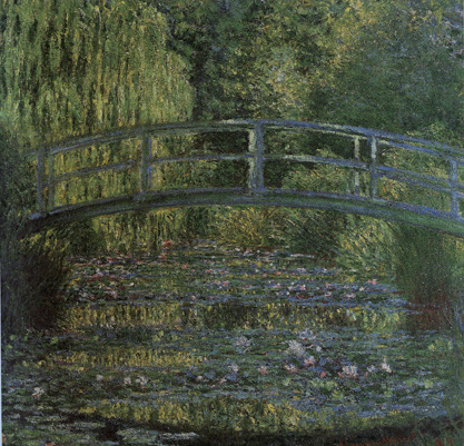 모네는 가난하게 살다가 장만한 집에 연못을 파고 수련을 심었다. 또한 연못 위로 둥근 다리를 놓고 연못 주위에는 온갖 화초와 등나무를 심었다. 그 연못을 모네는 ‘물 위의 정원’이라고 불렀다. 이 연못은 모네의 일본미술에 대한 관심의 반영으로 둥근 다리도 일본풍의 다리였다.