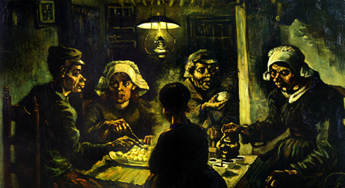 고흐의 그림속엔 남자인지 여자인지 잘 구분이 안 되는 희미한 램프불빛 아래에 다섯 사람의 농부가 식탁에 앉아 있다. 이들은 모두 모자를 눌러쓰고 있는데 중앙에 치마입은 여자가 등을 보이며 앉아있고, 왼쪽의 두 사람이 포크로 감자를 집으려 하고 있다. 오른쪽의 한 사람은 감자를 들고 있고, 또 한 사람은 주전자를 들고 찻잔에 커피를 따르는 농부들의 모습은 고단해 보이지만 편안한 저녁 식사를 하고 있다.