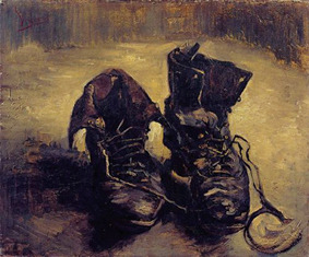 박애주의자로 한때 전도사가 되어 노동에 지친 탄광노동자들에게 위무의 복음을 전해주기도 한 고흐는, 그러나 곧 기독교를 일탈하고 만다. 이후 본격적으로 그림을 그리기 시작한 후 그가 끊임없이 관심을 가져온 것은 농부들의 삶이다. 그래서 밀레처럼 ‘씨 뿌리는 사람’, ‘밀밭’, ‘낫으로 풀을 베는 소년’, ‘식사하는 농촌 여인’, ‘이삭 줍는 여인’, ‘삽질하는 농부’, ‘꽃이 핀 복숭아나무’, ‘꽃이 핀 자두나무’, ‘수확’, ‘포도밭’ 등 일련의 농촌 관련의 그림을 수없이 그려낸다. 이처럼 고흐가 농촌과 농부들의 삶에 큰 관심을 갖게 된 것은 그들만이 진실한 삶을 살고 있다고 믿었기 때문이다. 또한 그들의 곤궁한 삶에 대한 연민이기도 했다. 그래서 고흐는 「농부의 손」을 그리기도 했는데 화면 전면에 “굵은 감자”처럼 투박해지고 거칠어진 농부의 손을 클로즈업 된 손에서 삶의 진정성을 엿보게 한다. 들에서 농기구를 쥐고 일하는 농부의 모습과 더불어 손을 보여주는 것이 아니라, 오직 손만으로도 그 손이 누구의 손인지를 보여주기도 하는 것이다. 특히 「한 짝의 구두」(1886)는 들에서 일하다가 벗어놓은 농부의 리얼리티를 실감나게 형상화한 작품이다. 고흐는 1886년부터 「한 짝의 구두」와 「세 짝의 구두」 등 세 편이 구두 그림을 그렸다. 일련의 구두 그림 중 우리나라 시인들이 가장 많이 시로 형상화한 1886년에 그린 「한 짝의 구두」이다. 이 그림 속의 구두는 끈이 풀어진 낡고 검은 구두 한 켤레가 화면을 가득 채우고 있다. 구두의 배경은 구체적으로 무엇인가를 알아볼 수 없는 공간으로 그려져 있어 주제를 살리기 위한 배경처리를 하고 있다. 이 작품에 대해 시로 전이시킨 시인은 박의상과 이승훈이 있는데 박의상의 「구두 1 -반 고흐의 그림 ‘구두’」를 살펴본다.