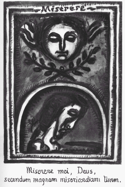 루오는 제1차 세계대전이 일어난 시기에 『미제레레』라는 판화집을 구상한다. 판화가로서의 능력을 충분히 발휘한 이 작품집엔 거의 모든 주제가 채택되어 있는데 용기 있게 사고하는 그리스도인을 드러내고 있다. 이 작품집은 1914년부터 10여년 동안 제작한 것들로 판화집 이름은 라틴어로 ‘불쌍히 여기소서’라는 의미를 나타낸다. 그의 온 영혼이 투사된 것으로 「전쟁은 세상의 어머니들이 미워하는 것」 「사람은 사람에게 늑대」 「삶은 가혹한 노동」 「그분의 상처를 통해 우리는 치유받았다」 「주님 자비를 베푸소서」 「베로니카의 수건에 그리스도의 얼굴이 나타나다」 등에서 짐작할 수 있듯이 세계대전의 잔학성과 신앙을 통한 구원의 염원을 이 판화집에 담아냈다. 하느님을 부인하는 세상 속에서 그리스도인들에게 “예술은 예술 이상의 어떤 것이다. 이는 성화 화가들이 항상 염두에 두었던 한 가지 진리다”라는 확신을 보여준다.