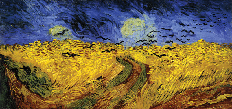 고흐의 「까마귀가 나는 밀밭」은 1890년 7월 24일 그렸다. 그가 죽기 5일 전이다. 이 그림을 그린 후 사흘 후인 7월 27일 들판에서 밀밭을 그리다가 권총으로 자신을 쏜 후 29일 숨을 거두었다. 이에 앞서 고흐는 7월 10일 유명한 「뇌운 아래 밀밭」을 그렸는데 마치 자신의 죽음을 예고하는 듯하다. 그는 동생 테오에게 보낸 편지에서 “폭풍우 이는 하늘아래 펼쳐진 광대한 밀밭이야. 큰 어려움 없이 절대적인 고독과 슬픔의 감정을 그려낼 수 있었다.”고 기술했다. 그런데 이 그림의 분위기가 지금껏 볼 수 없을 정도로 무겁다. 그의 말처럼 폭풍이 이는 풍경이다. 그런데 그 무렵 고흐는 동생 테오에게 보낸 편지에서 “앞으로 열심히 그림을 그리겠”다고 했지만 천형처럼 따라다니는 발작을 이기지 못하고 자살하고 만 것이다.