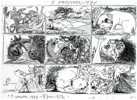 이 무렵 피카소는 「프랑코의 망상과 거짓」이라는 판화를 그려 독재자 프랑코에 대한 거부와 도덕적, 지성적 비열함을 강하게 비판하고 있다. 이 판화와 함께 “어린이들의 외침, 부녀자의 외침, 새들의 외침, 기둥과 돌들의 외침, 별들의 외침, 침대와 의자와 커튼과 항아리의 외침”이라는 고발의 글을 실어 인간애에 대한 뜨거움을 나타내었다.