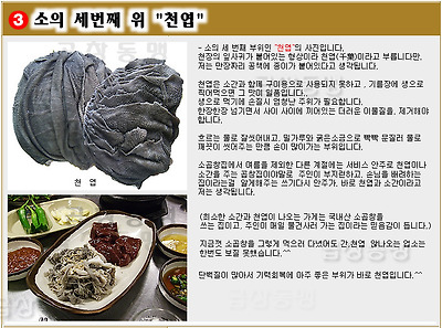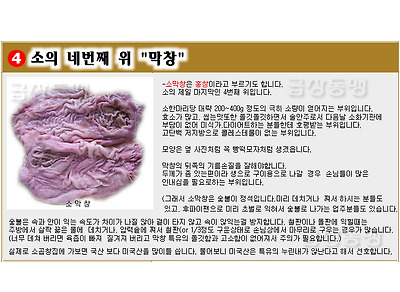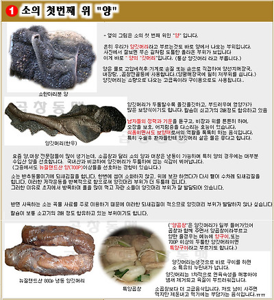 이상의 4가지 위에서 반추(되새김), 저작(씹음), 재혼합, 삼킴의 거친 후 소장으로 갑니다. 소곱창은 고기 자체가 질기며, 다루기 어려운 편입니다.(겉의 하얀 피막이 있음) 양과 소창은 전골의 식재료로써 전립투(氈笠套, 냄비의 일종)에서 조리한 것으로 '안주를 하던지, 밥을 말아먹던지 다 좋다'라고 특히 양은 위수술후 먹으면 위의 재생 속도가 무척 빠르다고 하여 수술후 회복기환자들이 많이 찾는 건강식 식품이기도 합니다. -젖소- 소의 고기에 대한 등급은 다음과 같습니다. 상식적인 이야기이므로 참고만 하십시요.