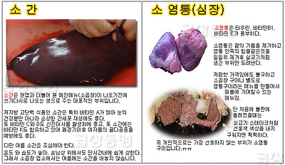 그외의 다른 소부산물로는 ",간, 심장(염통),소머리,지라, 신장(콩팥), 사골, 꼬리, 우족, 우설등이 있으나,