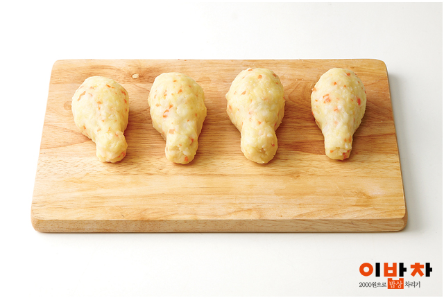 4. 감자밥을 8등분하고 속에 소시지를 넣어 닭다리 모양으로 빚고,