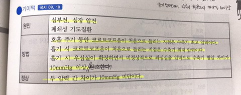 p.359 기이맥 작성자박정옥.|작성시간19.02.22|조회수442 목록 댓글 3 글자크기 작게가 글자크기 크게가 호흡주기동안 코르트코프음을 듣는다는데 언제 잰다는 건가요? 흡기시 최저 압력이라면 호기때 재는건가요? 이해가 잘 가지않네요 ㅠ 다음검색 현재 게시글 추가 기능 열기 북마크 공유하기 신고 센터로 신고 댓글 댓글 3 댓글쓰기 답글쓰기 댓글 리스트 작성자이지원 | 작성시간 19.03.02 혈압잴때 청진기를 압박대 속에 넣어서 잴때 이때 코르트코프음을 측정한다는 뜻입니다 작성자이지원 | 작성시간 19.03.02 수축기혈압에서 들숨에 100이고 날숨에 80 이라고 했을 때 이 차이가 10 이상이니까 기이맥이다~ 이런 뜻입니다 답댓글 작성자박정옥. 작성자 본인 여부 작성자 | 작성시간 19.03.04 감사합니다~ 댓글 전체보기