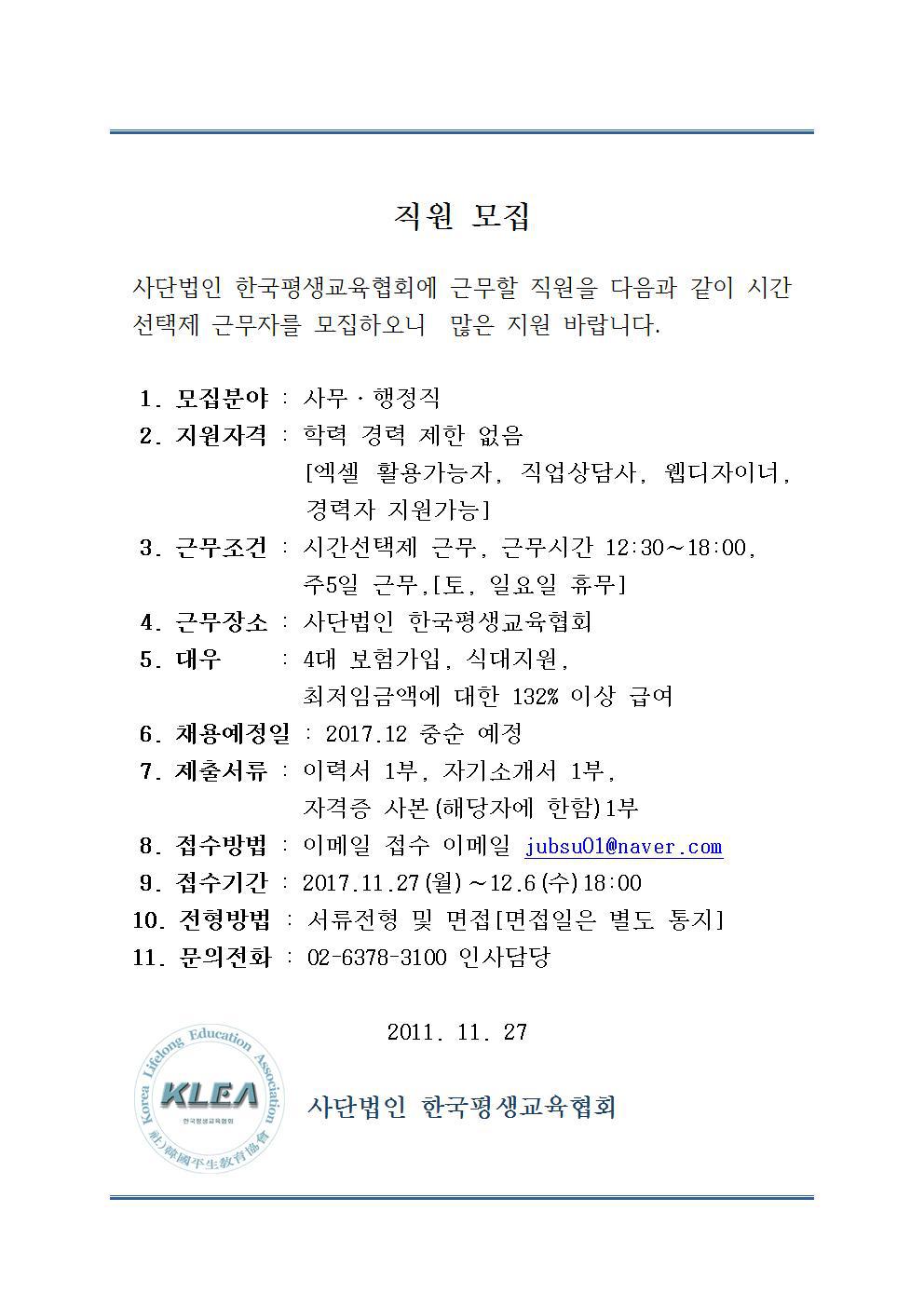 직원모집-시간선택제-한국평생교육협회 작성자한국평생교육협회|작성시간17.11.27|조회수25 목록 댓글 0 글자크기 작게가 글자크기 크게가 . 다음검색 현재 게시글 추가 기능 열기 북마크 공유하기 신고 센터로 신고 댓글 댓글 0 댓글쓰기 답글쓰기 댓글 리스트