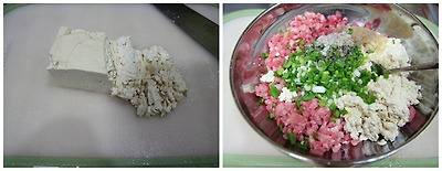 2. 볼에 으깬두부.갈은 돼지고기, 쇠고기 넣고 쪽파5개 다진거. 다진마늘1T. 고운소금1/2T.참기름1T.