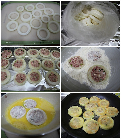 4. 부침가루 묻은 양파속에 위 2번에서 준비한 고기반죽을 넣어 채워줍니다.