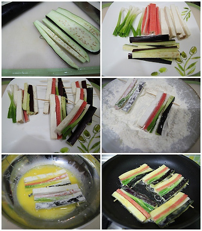 재료: 가지.새송이버섯.쪽파. 맛살. 부침가루. 달걀. 식용유
