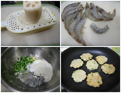 재료: 연근1개(300g. 길이 15cm정도). 새우10마리. 쪽파5개. 달걀1개. 부침가루1/2컵. 녹말가루2T.