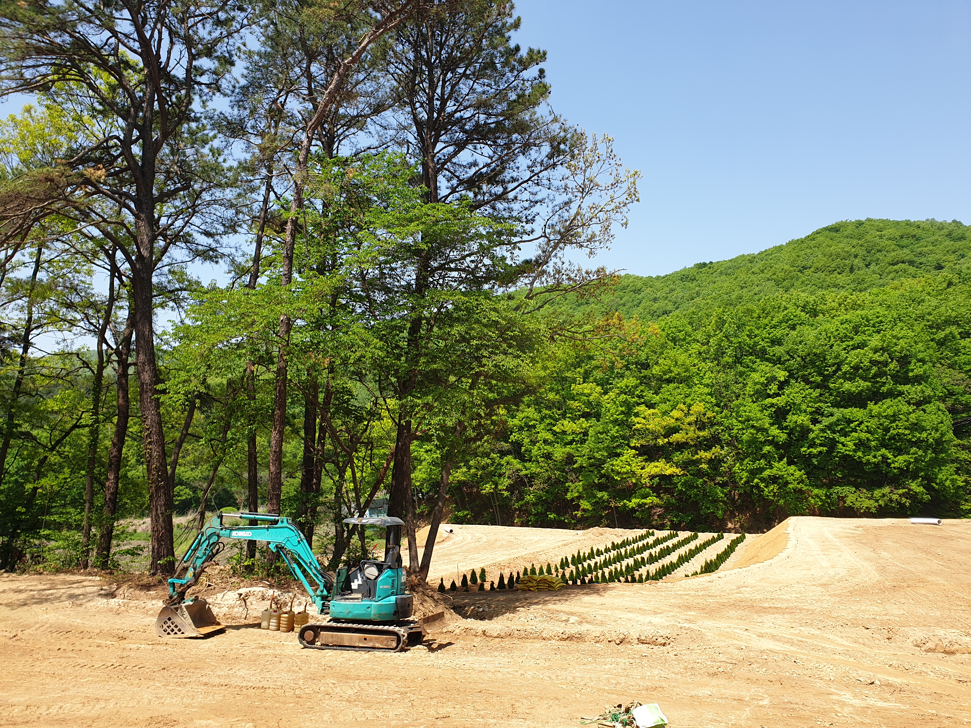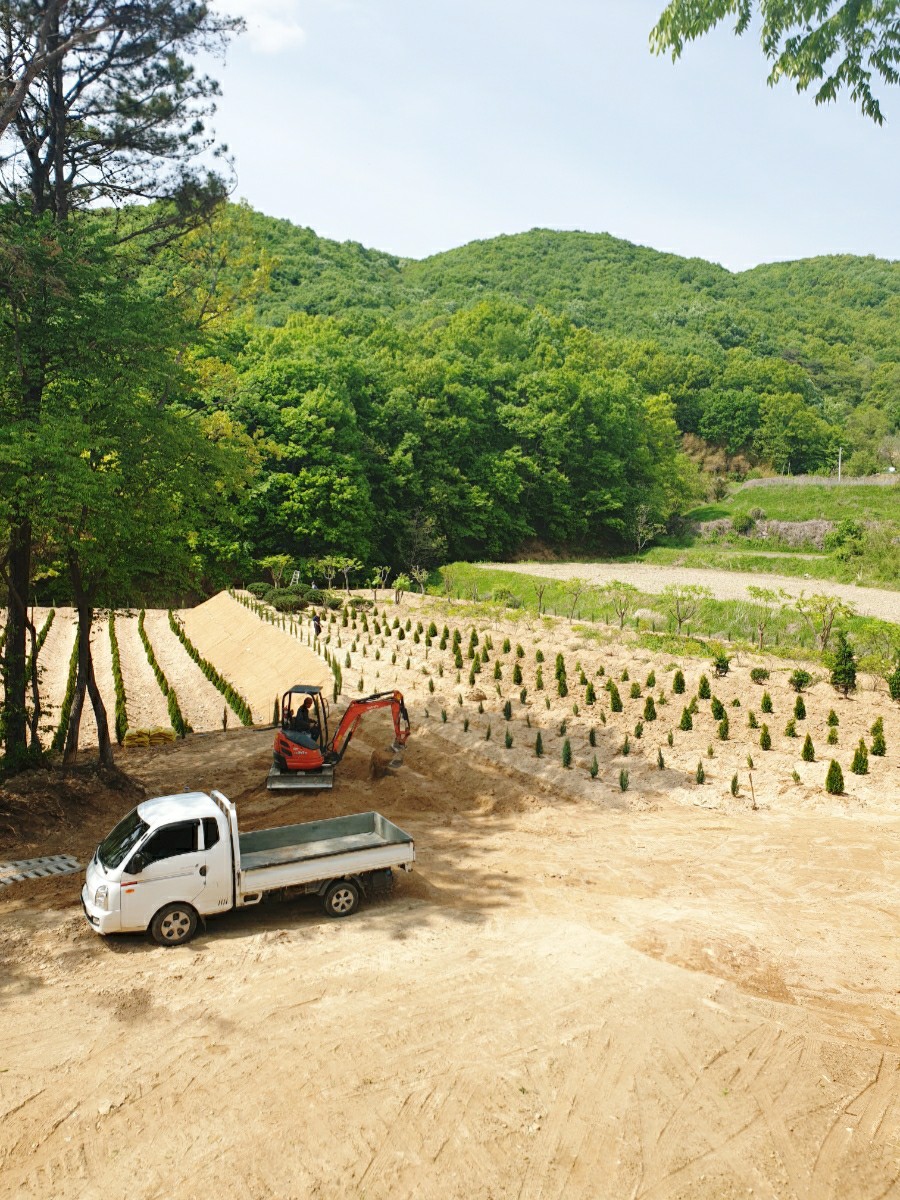 에메랄드 그린, 스카이로켓, 문그로우 묘목을 심고 주변에 단풍나무, 주목, 연산홍 등을 심었습니다. 두달이 지난 지금 몇 주 빼고는 잘 자리잡고 있네요. 덕분에 금리마을펜션 솔숲펜션의 주변이 예뻐지고 뷰가 좋아졌어요. 올 가을 단풍과 내년 봄의 연산홍도 기대해봅니다.