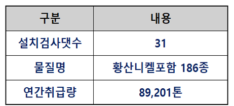 유해화학물질의 경우 설치검사 31대, 186종의 물질명이 등록 되어 있습니다.
