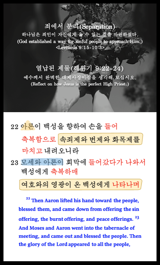 대제사장 아론은 제사장인 자신과 그의 아들들이 백성들을 대신하여 제물을 바친 후