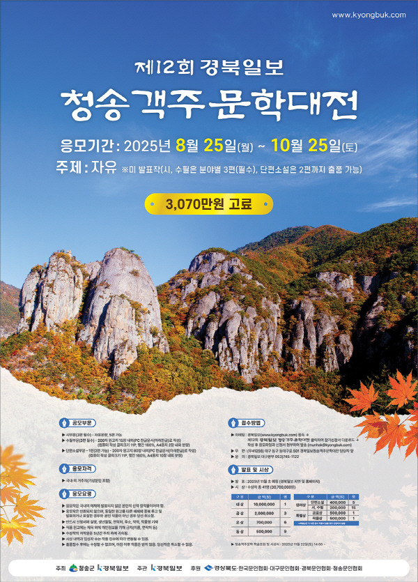 한편 ‘청송객주문학대전’은 청송군과 경북일보가 주최하고 경북일보가 주관, 경상북도·한국문인협회·대구문인협회·경북문인협회·청송문인협회가 후원한다.