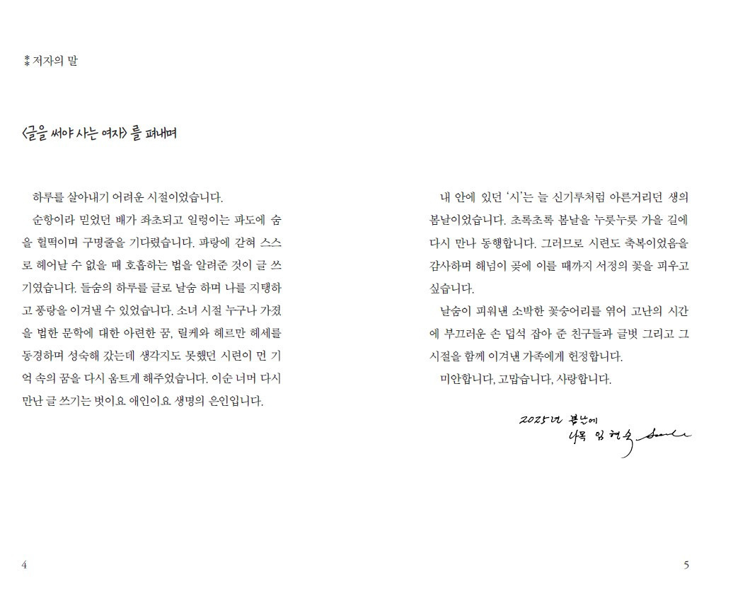 * 「글을 써야 사는 여자」는「 교보문고 」 , 「 영풍문고 」, 「 북센총판 」에서 만나 볼 수 있으며