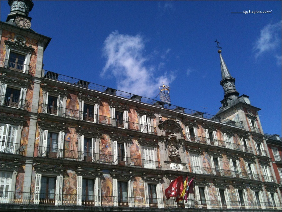 가로 90m 세로 109m 넓이의 광장으로 1580년에 시작해 1619년에 완성했다. 제빵 길드 건물의 우화적인 벽화는 1992년에 카를로스 프랑코가 12 별자리를 그린 것이란다. 좀 우스꽝스러워지고 보기가 민망한 그림도 있다. 광장 가운데에는 펠리페 3세의 동상이 있다. 남쪽 건물 밑에서는 마침 벼룩시장이 열려 관람을 한다. 동전, 메달, 액세서리 등이 진열되어 있어 돌아보았다.