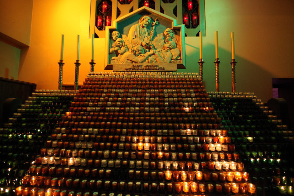 빛과 색으로 눈부시게 장식한 봉헌 예배당도 꼭 확인할 필요가 있다. 길고 비스듬하게 배치한 빨간색과 녹색 양초를 눈으로 좇으면 캐나다의 수호성인인 성 요셉의 불을 밝힌 조각상이 보인다. 푸른 빛이 위에서 조각상을 비추고 있다.