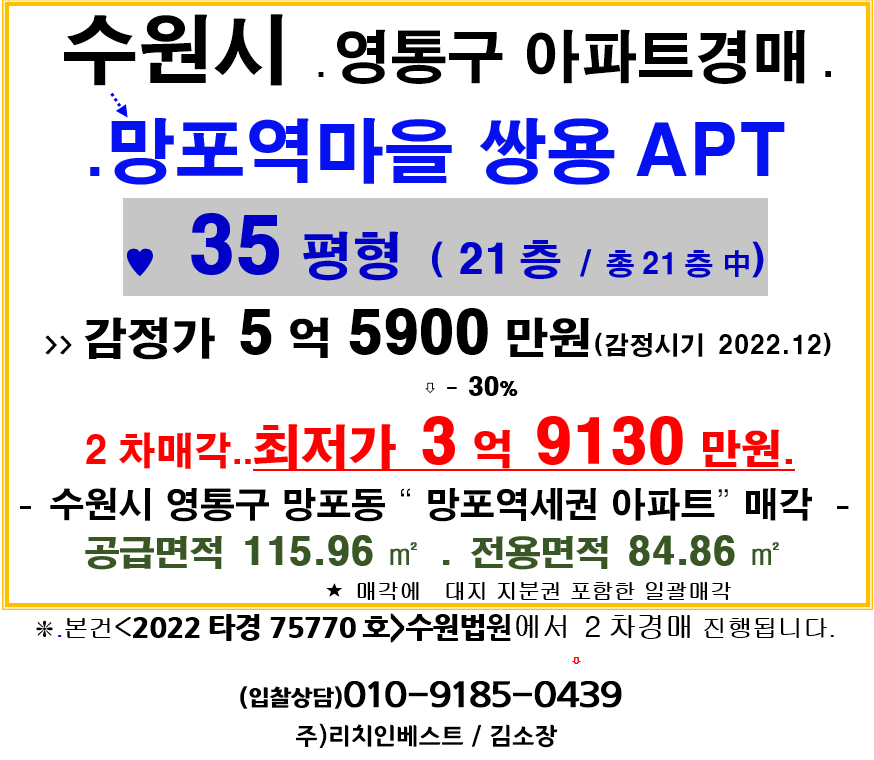 수원 영통구아파트>망포동 망포역마을 쌍용 35평형APT 2차경매(2022타경 75770)817