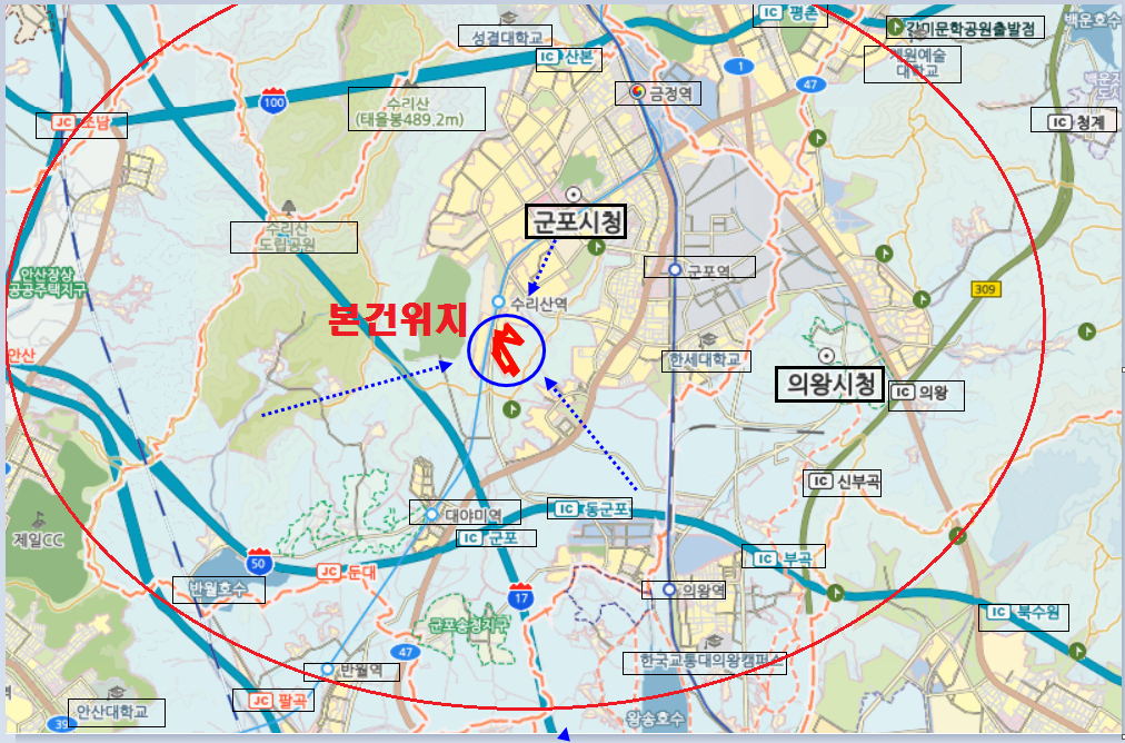 군포시청,군포시민체육광장,수리산도립공원,군포중앙도서관등이 지근거리.