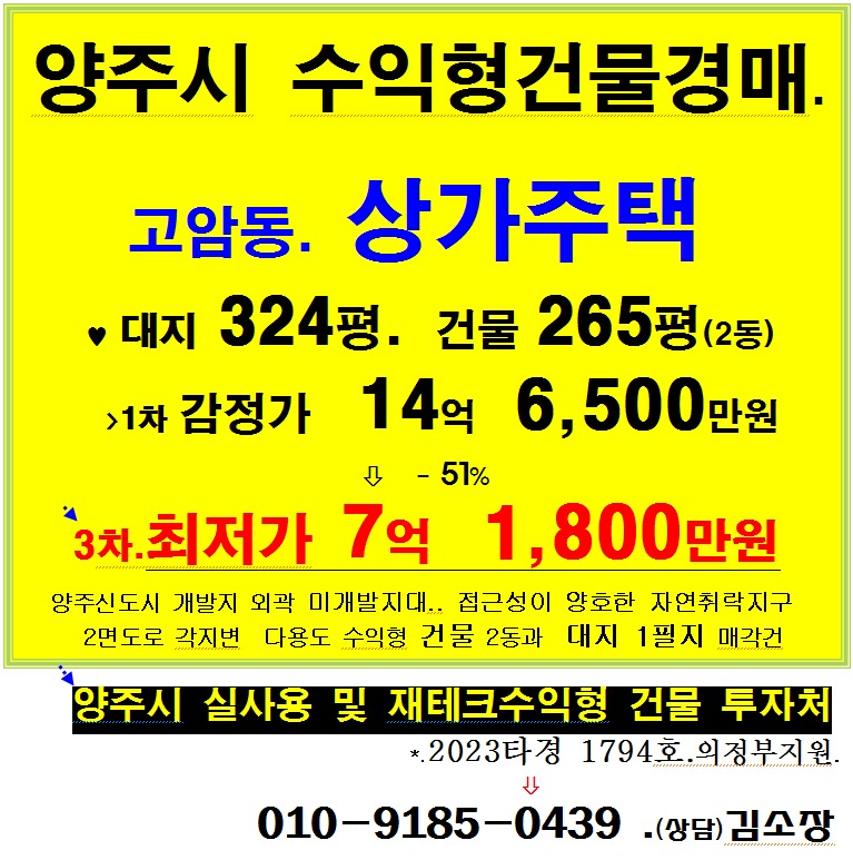 양주시 수익형 건물경매. 양주신도시접한 고암동 상가주택 3차경매(23-1794)723