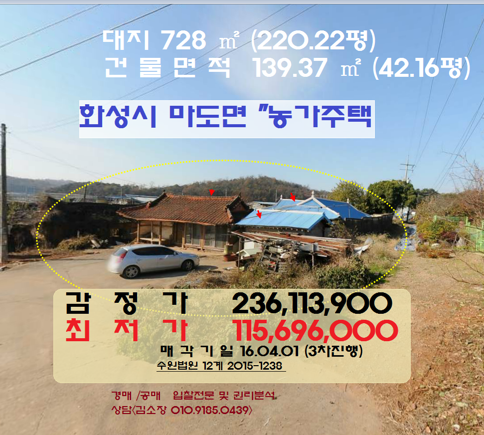 공지- 정식적으로 입찰의뢰시엔 "초도 등록비"가 입금되야 계약관계가 성립하고 조사가 시작됩니다. 낙찰시엔 "성공수수료(감정가이하~기준최하수수료 200만)"가 소요됩니다. .아래는..주변지역 현재 "진행매물 목록"입니다.(관심건은 문자로 사건번호을 보내주세요)