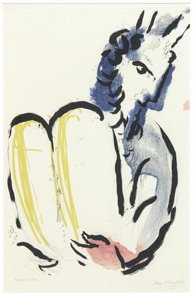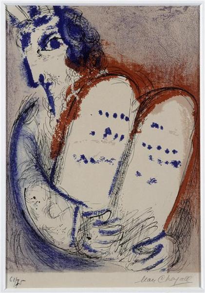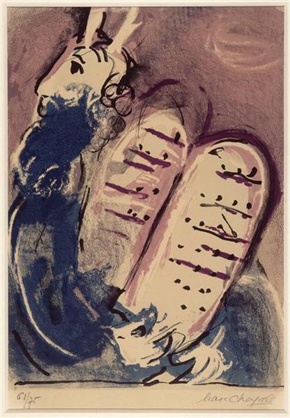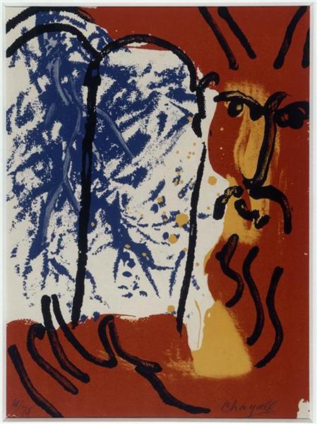 Moses with the Tablets of the Law. 1956. lithography, paper. 26.5 x 36 cm. Series: Bible lithographs. Musée national Message Biblique Marc Chagall, Nice, France