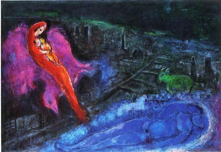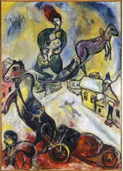 하지만 1차 세계대전으로 인해 샤갈은 조국 러시아는 떠나 프랑스로 망명을 한다. 샤갈은 파리에서 가족과 함께 머물면서 행복한 감정을 환상적으로 표현하기 시작했다. 그러나 파리에서의 평화로움은 곧이어 터진 세계 2차 대전으로 인해 깨진다.