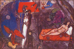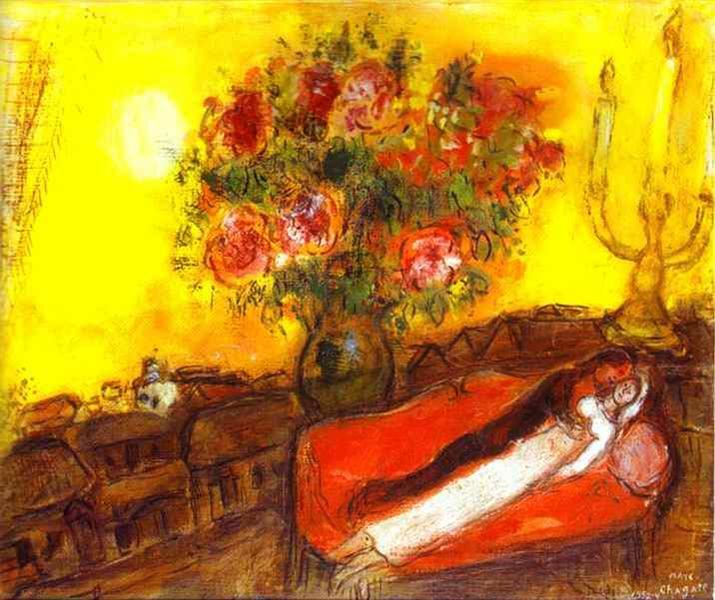 이 작품은 근 10년간이나 걸려 완성시킨 그림이다. 여기엔 그전까지의 삶의 기쁨으로서의 환상과 서정을 노래하던 샤갈의 모든 환상의 요소가 다 들어 있다. 시간의 흐름을 나타내는 날개 달린 시계, 몸을 붙인 연인들, 염소와 말, 고향의 마을과 하늘, 그리고 바이올린, 천사....반면, 침대에 길게 누운 젊은 여인의 나상은 현실적 관능미와 청결함을 발산하고 있다. 전체적으로 대단히 복잡한 화면 구성이긴 하지만, 내용의 여러 요소들은 색채의 특이한 발언과 부드럽고 미묘한 뉘앙스의 확산 속에 깊은 정감을 자아내고 있다.