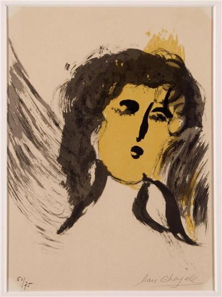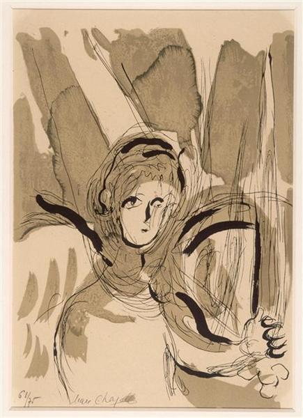 An angel. 1956. lithography, paper . 27.5 x 37.5 cm. Series: Bible lithographs. Musée national Message Biblique Marc Chagall, Nice, France