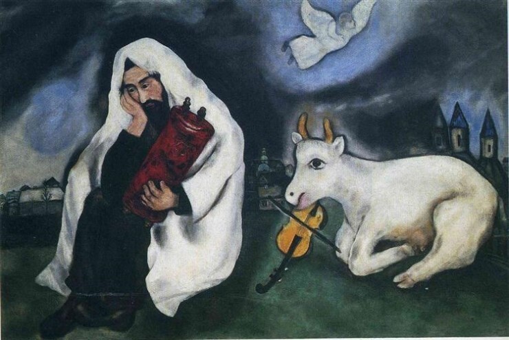 고독의 주제는 처음이 아니다. 10년전 그려진 <푸른 유태인 (또는 교부)>도 홀로 수심에 잠겨 있었다. 그러나 이 그림은 토라를 안은 교부 곁에 위로하는 기호(바이올린)가 있기 때문에, 그리고 또 교부는 그것을 등지고 있기 때문에 더욱 에수가 깃들어 있다. 배경은 비태프스크의 집들인데, 그 후에는 성서의 세계와 향리가 샤갈의 작품 중에서 슬픔과 사랑의 이중주를 연주하게 될것이다. 이 고독자의 자세는 2,500년 전의 이스라엘의 예언자들의 자세이다.