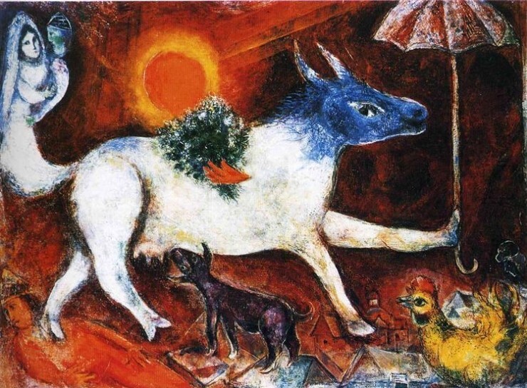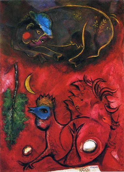 암소, 황소, 당나귀, 말, 염소, 수탉, 물고기는 샤갈의 세계를 가장 명확하게 표현하는 동물들이다. 비테부르크의 세계에서 유래하는 동물들은 유대교를 상징하며 숭고함을 함축하고 있다.