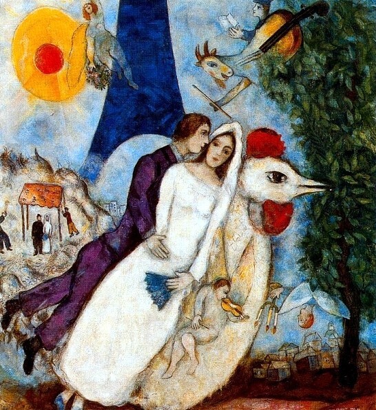 벨라루스 태생인 샤갈은 파리로 건너와 본격적인 작가의 이력을 쌓았는데, 나치의 위협을 피해 프랑스 생활을 청산하고 미국 이민을 떠나기 직전에 완성한 그림이다. 동물과 인물이 뒤섞인 구성으로 이제 막 결혼식을 마친 신혼의 로맨스가 잘 드러난다. 예술 도시 거주자의 자부심이 드러난 에펠탑의 전경을 통해 로맨틱함을 표현했다.