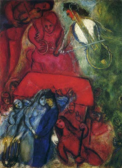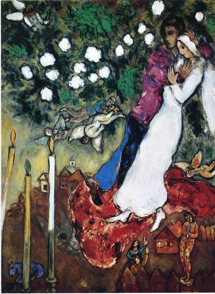 그림 속 주인공인 신랑과 신부는 마르크 샤갈 본인과 사랑하는 아내 벨라다. 샤갈은 ‘오직 벨라를 통해서만 사랑을 느끼고 행동하고 그림을 그려왔다’고 고백했을 만큼 아내를 완벽하게 사랑했다. 러시아 태생의 유대인인 샤갈은 고난의 연속이었던 자기 삶의 유일한 희망이자 빛을 아내 벨라에게서 보았다.