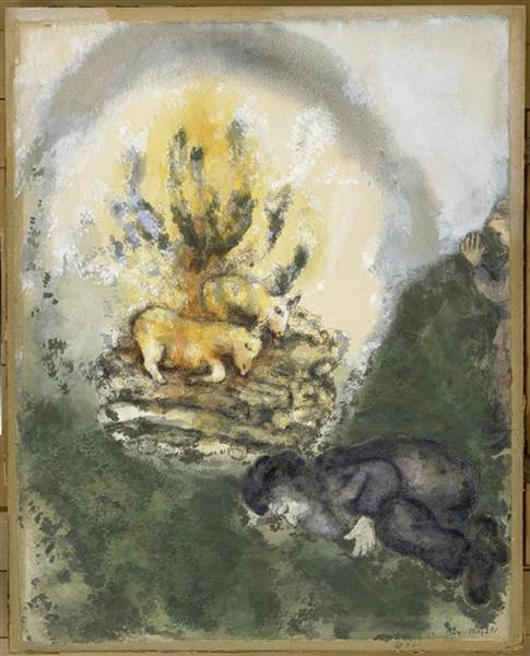 Moses received the Tablets of Law. 1956. lithography, paper. 26.5 x 36 cm. Series: Bible lithographs. Musée national Message Biblique Marc Chagall, Nice, France