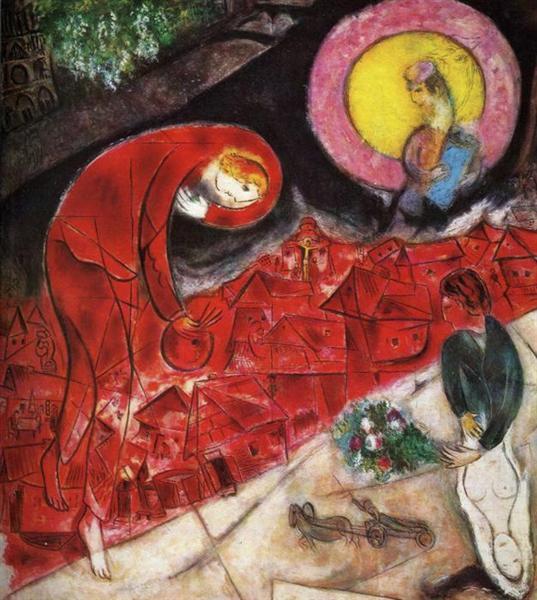 이 작품 샤갈의 애처 벨라가 세상을 떠난 다음 해에 그려졌다. 파리 해방과 더불어 파리개방의 소식을 듣고 뛸 듯이좋아하던 벨라가 갑자기 돌아오지 않은 사람으로 그의 곁을 떠나고, 샤갈은 그 슬픔을 통하여 그녀와의 삶을 이 작품에서,마치 스테인 글라스의 작품처럼 투명하고 심오한 색으로 표현했다.