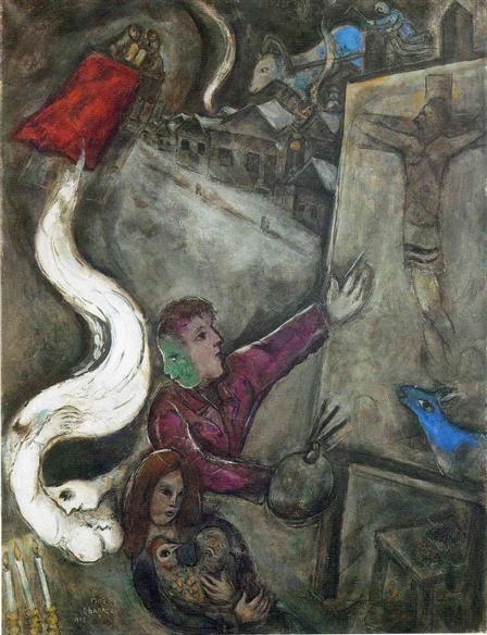 위 그림(프랑스 파리 퐁피두센터 소장)은 샤갈이 미국에 피란 중이었던 1943년에 그린 것이다. 그는 그즈음에 자신의 정든 고향인 비텝스크가 나치 독일의 공격을 받아 많은 유대인이 학살당했다는 소식을 접했다. 그는 상실감에 괴로워하며 고향과 유대인들이 전쟁으로 겪은 수난을 증언하고자 했다.