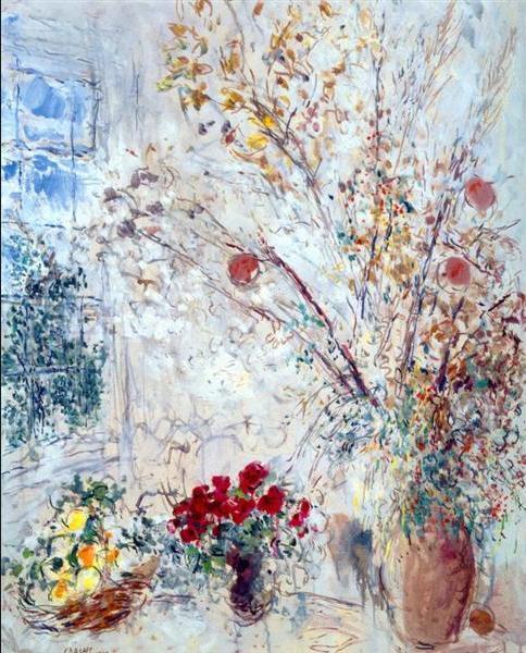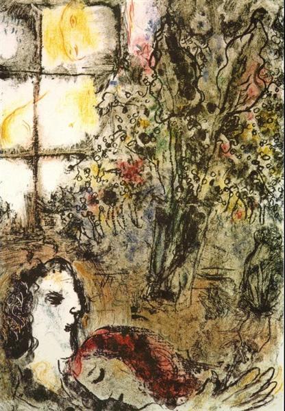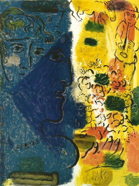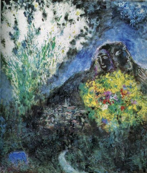 샤갈이 많이 제작했던 스테인드 글라스 풍의 작품이다. 화폭을 좌우로 양분하여 인생의 그늘과 양지를 표현하고 있다. 전쟁과 혁명으로 인해 상처받고 힘들었던 시간들과 자연과 사랑으로 인해 행복했던 기억들을 인생의 말년에 열정적으로 보여주고 있다. 그늘진 얼굴의 사람이 오른쪽 끝의 여인에게 꽃다발을 건네고 있다