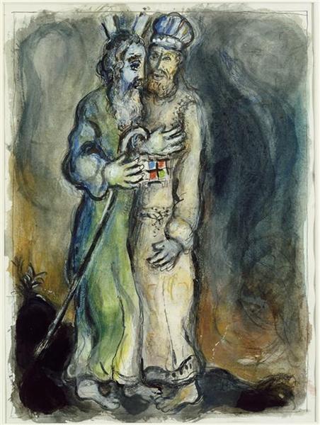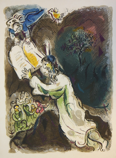 Moise blesses Joshua. 1966. Series: The Story of the Exodus. lithography. paper. 31.9 x 44.1 cm. Musée national Message Biblique Marc Chagall, Nice, France .