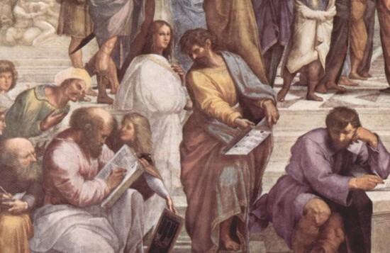 만물의 근원이 '숫자'라고 주장한 피타고라스가 여기 있다. 왼쪽의 하얀색 옷을 입은 노인. 그의 사후에 피타고라스 학파가 설립되었고, 흔히 오늘날 사람들이 알고 있는 것처럼 종교 단체로 치부되기도 했다. 그에 관한 모든 전설은 그 때부터 나온 것이다.