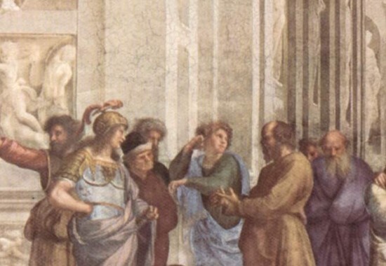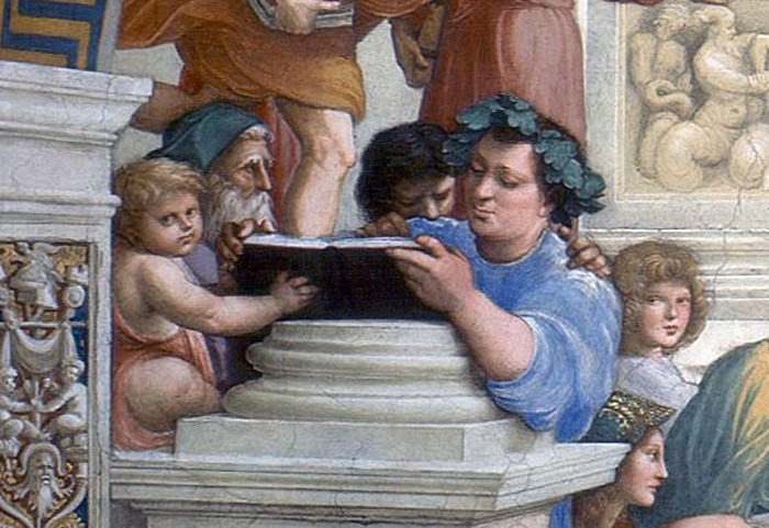 \그가 무엇을 적고 있는지 힐끗힐끗 쳐다보고 있는 두 명의 학자들 모습이 익살스러우면서도 재미있다. 라파엘로의 애인도 이 부분에 그려져 있다. '마르게리타'라는 이름을 가진 그녀는 마치 르네상스 화가들이 화폭에 그리던 천사를 닮았다. 우측에서 불편한 자세로 고뇌하고 있는 학자는 최근에서야 다시 주목받기 시작한 헤라클레이토스이다.