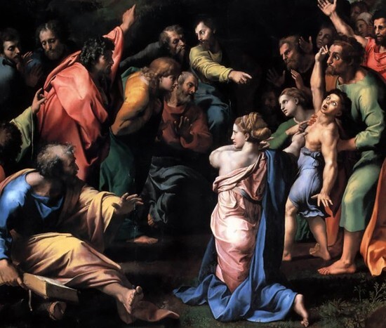 하단 중앙부에서 한 노인이 소년을 향해 손가락을 뻗고 있다. 진홍색 옷을 입고 있는 다른 사람은 예수에게로 손가락을 뻗고 있다. 그렇다. 영화 <엑소시스트>에서 봤던 것처럼 지금 소년은 마귀에 들린 상태이다. 화폭의 왼쪽 하단은, 그래서 온통 절망의 일색이다