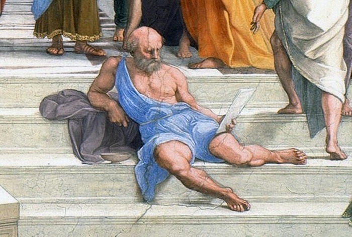 사실 <아테네 학당>에서 가장 눈길을 끄는 것은 화면 정중앙에서 거의 반라로 계단에 걸터앉아 무언가를 읽고 있는 노인이다. 사람들은 생각할 테다. 플라톤과 아리스토텔레스가 계단까지 걸어오는 형상인데, 과연 그들의 무리가 자신에게 오면 이 노인은 자리를 비켜줄 것인가? 아니면 무리가 그를 에둘러 갈 것인가?